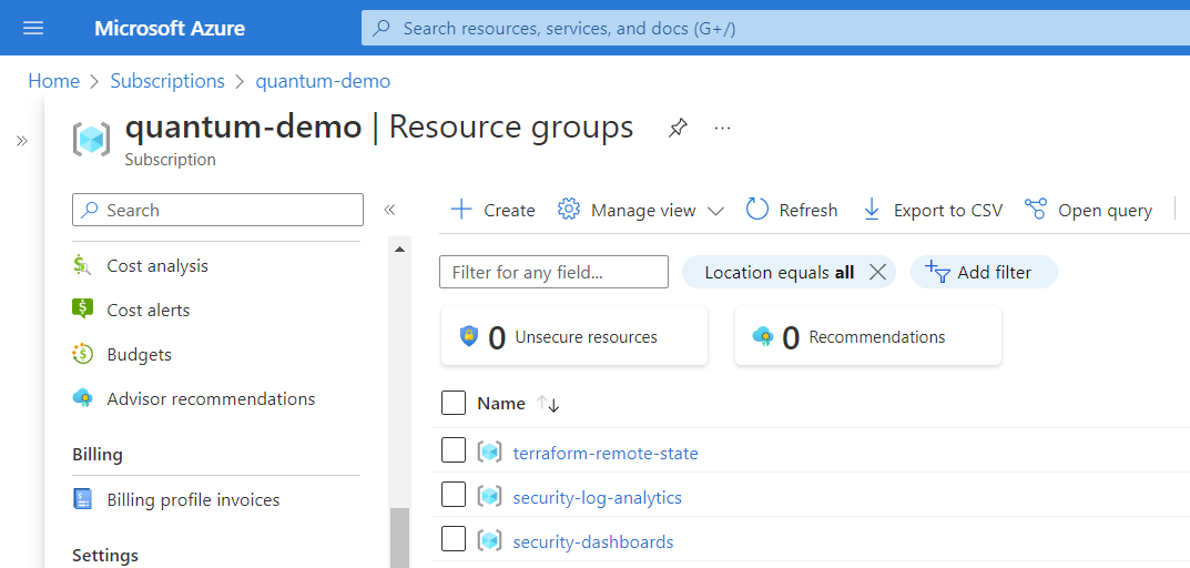 Once you have successfully run the update-environment script, you will be able to verify that the following resource groups for remote-state, log-analytics & dashboards have been created in Azure Portal