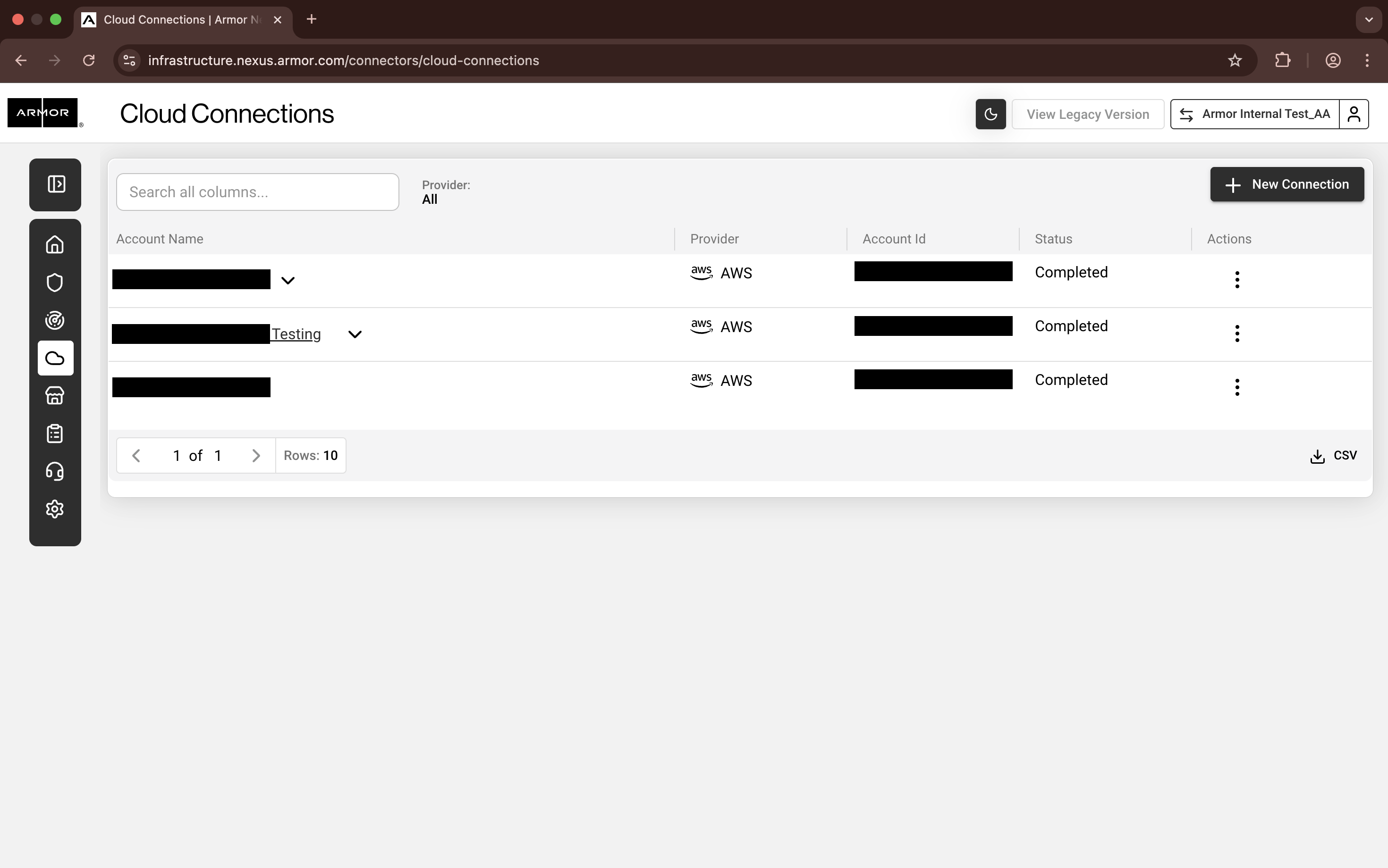 You can follow the same steps in the legacy Armor Management Portal (AMP). The Cloud Connections screen is located under Account.