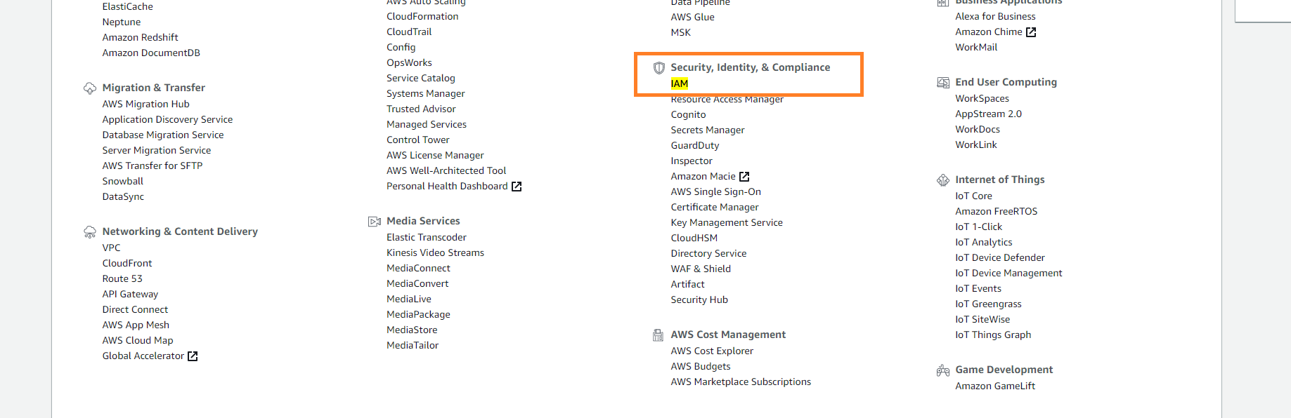 Under Security, Identity & Compliance, click IAM.