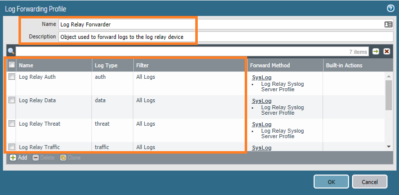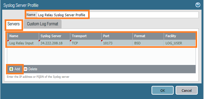 In the Syslog window, click Add, then select the Log Relay Syslog Server Profile that you created in step 4.