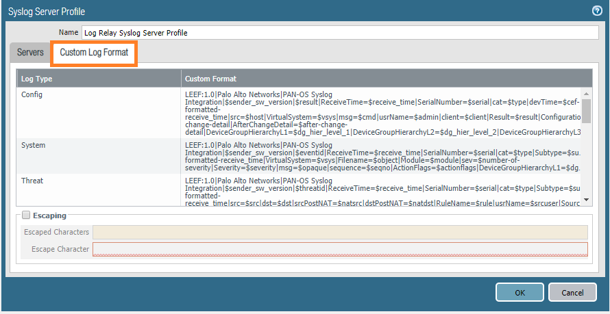 Log Type Custom Format Wildfire LEEF:1.0|Palo Alto Networks|PAN-OS Syslog Integration|$sender_sw_version|$threatid|ReceiveTime=$receive_time|SerialNumber=$serial|cat=$type|Subtype=$subtype|devTime=$cef-formatted-receive_time|src=$src|dst=$dst|srcPostNAT=$natsrc|dstPostNAT=$natdst|RuleName=$rule|usrName=$srcuser|SourceUser=$srcuser|DestinationUser=$dstuser|Application=$app|VirtualSystem=$vsys|SourceZone=$from|DestinationZone=$to|IngressInterface=$inbound_if|EgressInterface=$outbound_if|LogForwardingProfile=$logset|SessionID=$sessionid|RepeatCount=$repeatcnt|srcPort=$sport|dstPort=$dport|srcPostNATPort=$natsport|dstPostNATPort=$natdport|Flags=$flags|proto=$proto|action=$action|Miscellaneous=$misc|ThreatID=$threatid|URLCategory=$category|sev=$number-of-severity|Severity=$severity|Direction=$direction|sequence=$seqno|ActionFlags=$actionflags|SourceLocation=$srcloc|DestinationLocation=$dstloc|ContentType=$contenttype|PCAP_ID=$pcap_id|FileDigest=$filedigest|Cloud=$cloud|URLIndex=$url_idx|RequestMethod=$http_method|FileType=$filetype|Sender=$sender|Subject=$subject|Recipient=$recipient|ReportID=$reportid|DeviceGroupHierarchyL1=$dg_hier_level_1|DeviceGroupHierarchyL2=$dg_hier_level_2|DeviceGroupHierarchyL3=$dg_hier_level_3|DeviceGroupHierarchyL4=$dg_hier_level_4|vSrcName=$vsys_name|DeviceName=$device_name|SrcUUID=$src_uuid|DstUUID=$dst_uuid|TunnelID=$tunnelid|MonitorTag=$monitortag|ParentSessionID=$parent_session_id|ParentStartTime=$parent_start_time|TunnelType=$tunnel|ThreatCategory=$thr_category|ContentVer=$contentver User-ID LEEF:1.0|Palo Alto Networks|PAN-OS Syslog Integration|$sender_sw_version|$subtype|ReceiveTime=$receive_time|SerialNumber=$serial|cat=$type|Subtype=$subtype|devTime=$cef-formatted-receive_time|FactorType=$factortype|VirtualSystem=$vsys|DataSourceName=$datasourcename|DataSource=$datasource|DataSourceType=$datasourcetype|FactorNumber=$factorno|VirtualSystemID=$vsys_id|TimeoutThreshold=$timeout|src=$ip|srcPort=$beginport|dstPort=$endport|RepeatCount=$repeatcnt|usrName=$user|sequence=$seqno|EventID=$eventid|FactorCompletionTime=$factorcompletiontime|DeviceGroupHierarchyL1=$dg_hier_level_1|DeviceGroupHierarchyL2=$dg_hier_level_2|DeviceGroupHierarchyL3=$dg_hier_level_3|DeviceGroupHierarchyL4=$dg_hier_level_4|vSrcName=$vsys_name|DeviceName=$device_name|ActionFlags=$actionflags URL Filtering LEEF:1.0|Palo Alto Networks|PAN-OS Syslog Integration|$sender_sw_version|$threatid|ReceiveTime=$receive_time|SerialNumber=$serial|cat=$type|Subtype=$subtype|devTime=$cef-formatted-receive_time|src=$src|dst=$dst|srcPostNAT=$natsrc|dstPostNAT=$natdst|RuleName=$rule|usrName=$srcuser|SourceUser=$srcuser|DestinationUser=$dstuser|Application=$app|VirtualSystem=$vsys|SourceZone=$from|DestinationZone=$to|IngressInterface=$inbound_if|EgressInterface=$outbound_if|LogForwardingProfile=$logset|SessionID=$sessionid|RepeatCount=$repeatcnt|srcPort=$sport|dstPort=$dport|srcPostNATPort=$natsport|dstPostNATPort=$natdport|Flags=$flags|proto=$proto|action=$action|Miscellaneous=$misc|ThreatID=$threatid|URLCategory=$category|sev=$number-of-severity|Severity=$severity|Direction=$direction|sequence=$seqno|ActionFlags=$actionflags|SourceLocation=$srcloc|DestinationLocation=$dstloc|ContentType=$contenttype|PCAP_ID=$pcap_id|FileDigest=$filedigest|Cloud=$cloud|URLIndex=$url_idx|RequestMethod=$http_method|UserAgent=$user_agent|identSrc=$xff|Referer=$referer|Subject=$subject|DeviceGroupHierarchyL1=$dg_hier_level_1|DeviceGroupHierarchyL2=$dg_hier_level_2|DeviceGroupHierarchyL3=$dg_hier_level_3|DeviceGroupHierarchyL4=$dg_hier_level_4|vSrcName=$vsys_name|DeviceName=$device_name|SrcUUID=$src_uuid|DstUUID=$dst_uuid|TunnelID=$tunnelid|MonitorTag=$monitortag|ParentSessionID=$parent_session_id|ParentStartTime=$parent_start_time|TunnelType=$tunnel|ThreatCategory=$thr_category|ContentVer=$contentver Tunnel Inspection LEEF:1.0|Palo Alto Networks|PAN-OS Syslog Integration|$sender_sw_version|$action|ReceiveTime=$receive_time|SerialNumber=$serial|cat=$type|Subtype=$subtype|devTime=$cef-formatted-receive_time|src=$src|dst=$dst|srcPostNAT=$natsrc|dstPostNAT=$natdst|RuleName=$rule|usrName=$srcuser|SourceUser=$srcuser|DestinationUser=$dstuser|Application=$app|VirtualSystem=$vsys|SourceZone=$from|DestinationZone=$to|IngressInterface=$inbound_if|EgressInterface=$outbound_if|LogForwardingProfile=$logset|SessionID=$sessionid|RepeatCount=$repeatcnt|srcPort=$sport|dstPort=$dport|srcPostNATPort=$natsport|dstPostNATPort=$natdport|Flags=$flags|proto=$proto|action=$action|sequence=$seqno|ActionFlags=$actionflags|DeviceGroupHierarchyL1=$dg_hier_level_1|DeviceGroupHierarchyL2=$dg_hier_level_2|DeviceGroupHierarchyL3=$dg_hier_level_3|DeviceGroupHierarchyL4=$dg_hier_level_4|vSrcName=$vsys_name|DeviceName=$device_name|TunnelID=$tunnelid|MonitorTag=$monitortag|ParentSessionID=$parent_session_id|ParentStartTime=$parent_start_time|TunnelType=$tunnel|totalBytes=$bytes|dstBytes=$bytes_received|srcBytes=$bytes_sent|totalPackets=$packets|dstPackets=$pkts_received|srcPackets=$pkts_sent|MaximumEncapsulation=$max_encap|UnknownProtocol=$unknown_proto|StrictChecking=$strict_check|TunnelFragment=$tunnel_fragment|SessionsCreated=$sessions_created|SessionsClosed=$sessions_closed|SessionEndReason=$session_end_reason|ActionSource=$action_source|startTime=$start|ElapsedTime=$elapsed Traffic LEEF:1.0|Palo Alto Networks|PAN-OS Syslog Integration|$sender_sw_version|$action|cat=$type|ReceiveTime=$receive_time|SerialNumber=$serial|Type=$type|Subtype=$subtype|devTime=$cef-formatted-receive_time|src=$src|dst=$dst|srcPostNAT=$natsrc|dstPostNAT=$natdst|RuleName=$rule|usrName=$srcuser|SourceUser=$srcuser|DestinationUser=$dstuser|Application=$app|VirtualSystem=$vsys|SourceZone=$from|DestinationZone=$to|IngressInterface=$inbound_if|EgressInterface=$outbound_if|LogForwardingProfile=$logset|SessionID=$sessionid|RepeatCount=$repeatcnt|srcPort=$sport|dstPort=$dport|srcPostNATPort=$natsport|dstPostNATPort=$natdport|Flags=$flags|proto=$proto|action=$action|totalBytes=$bytes|dstBytes=$bytes_r