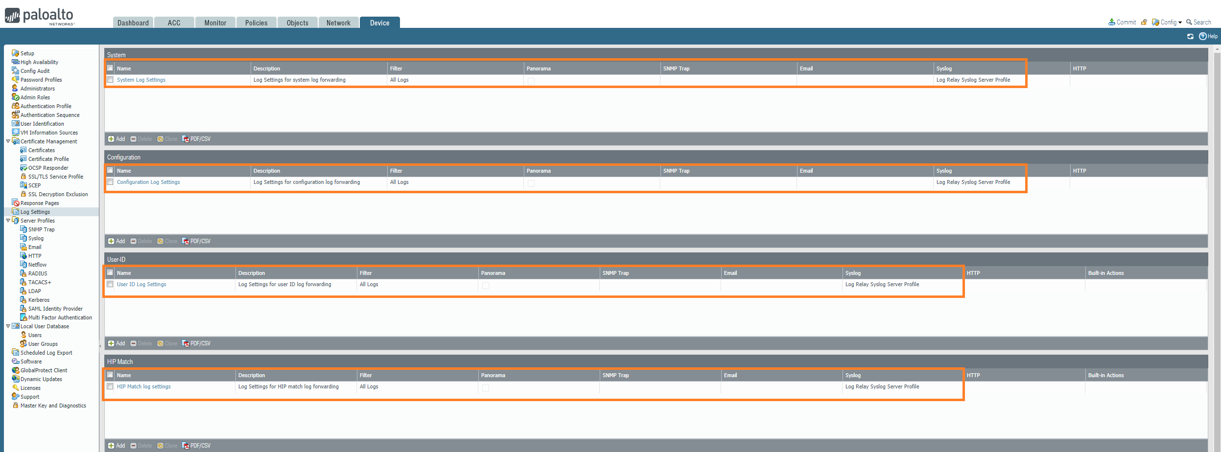 Select Device, then select Server Profiles, followed by Syslog.