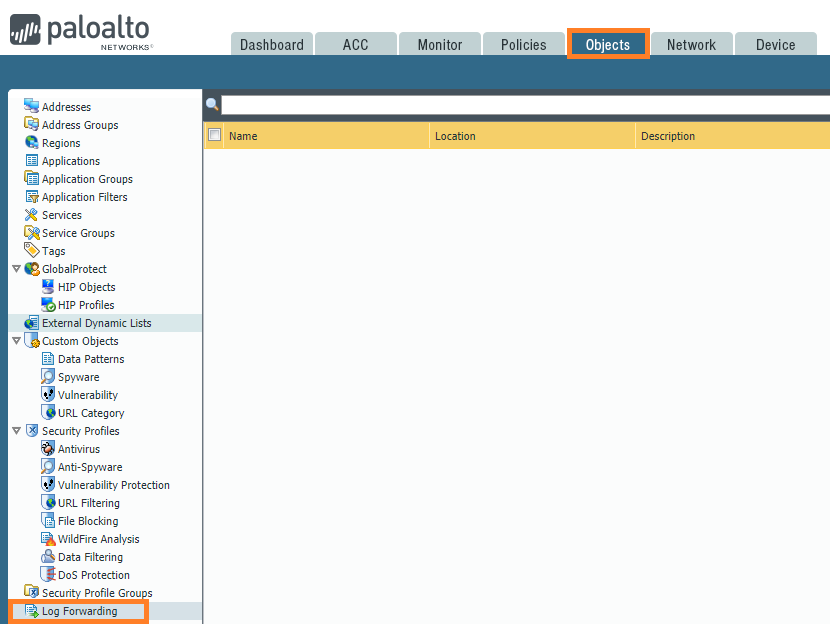 In the bottom left-side of the screen, click Add to create a new Log Forwarding object.