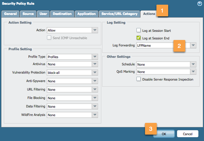 Next, go to the Actions tab, select Log Forwarding Profile from the dropdown, and click OK when you are happy with your configuration: