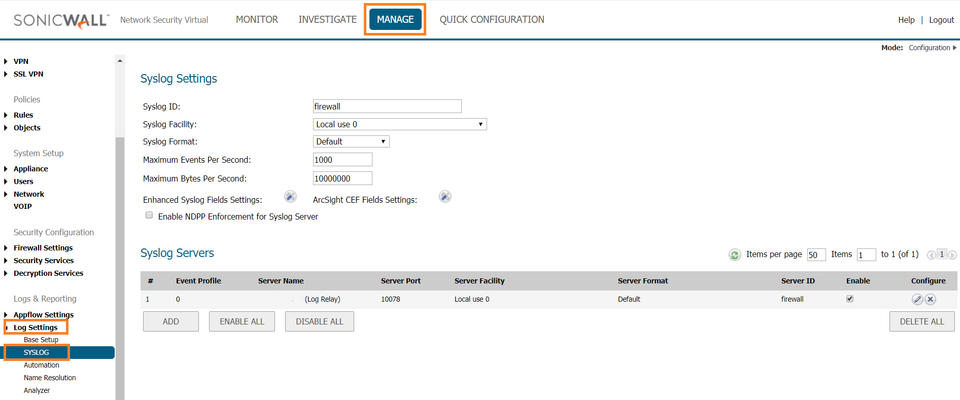Under Logs & Reporting, click Log Settings, then click SYSLOG.