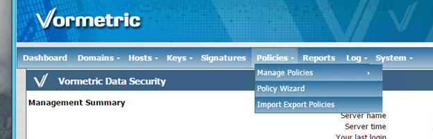 At the top, click Policies to create a new policy and to see a list of existing policies. For the purpose of this exercise, you can disregard the drop-down menu items.