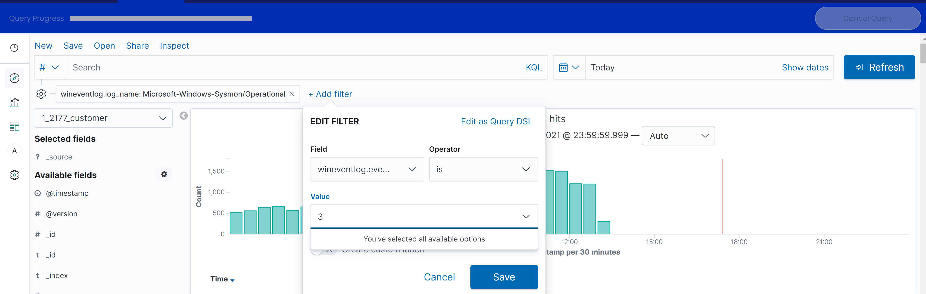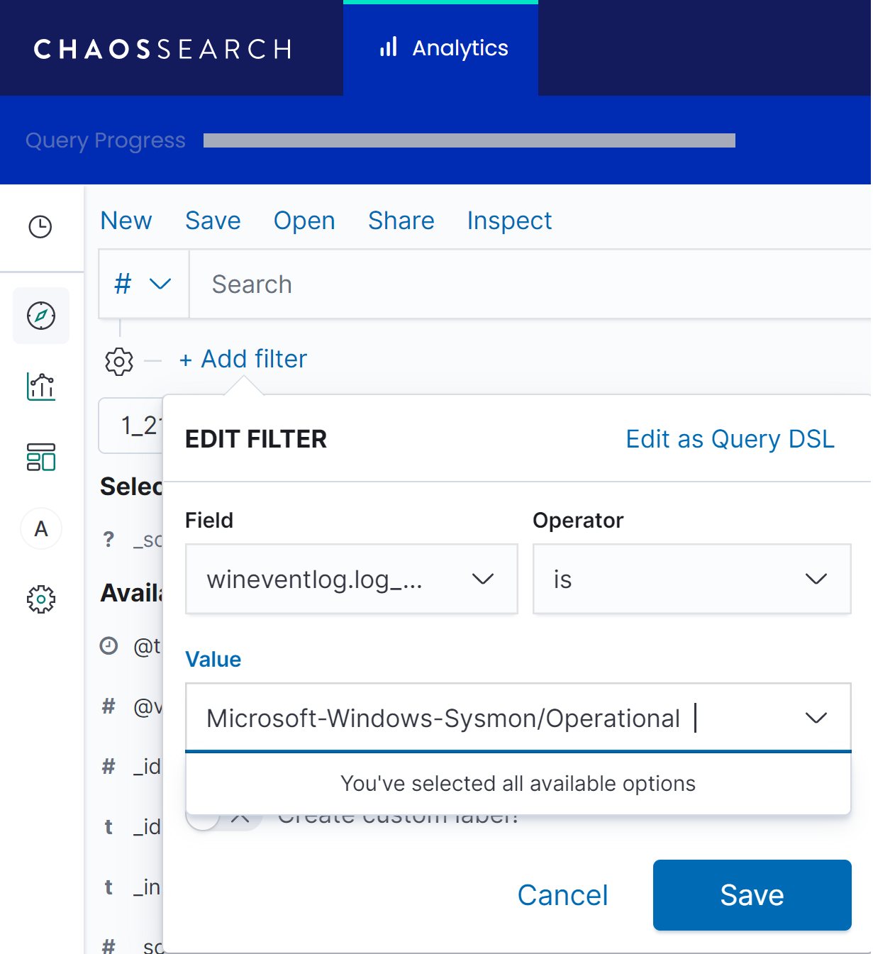 Then set the field to one of the helpful fields above, select the operator, put in the value and hit save. The data is now filtered on a specific log_name, event_id or other field selected.
