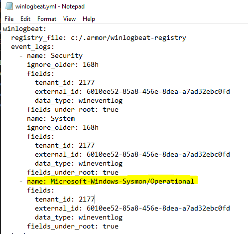 Add the event log, specific to Sysmon, to the Armor logging service.