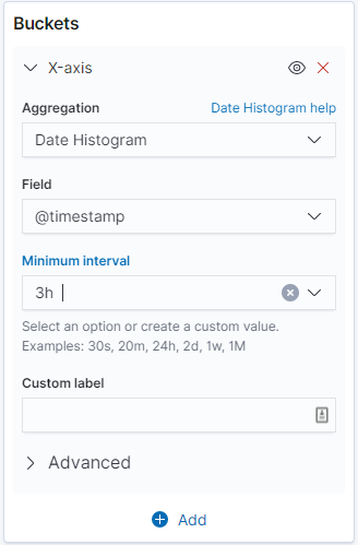 Two buckets are needed to configure this visualization. Under Buckets, click the Add button, making sure to select X-axis.