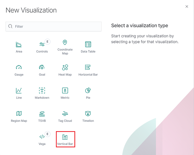 In the New Visualization pop up, select the Vertical Bar visualization option.