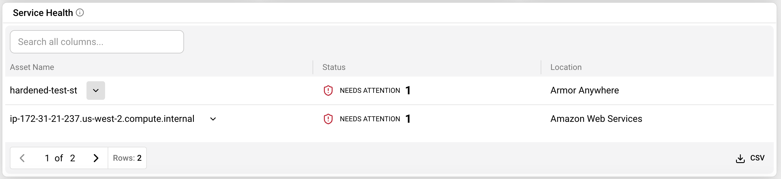 This table highlights the health status of individual assets. Unhealthy services older than 24 hours may negatively impact the Protection Score. It includes: