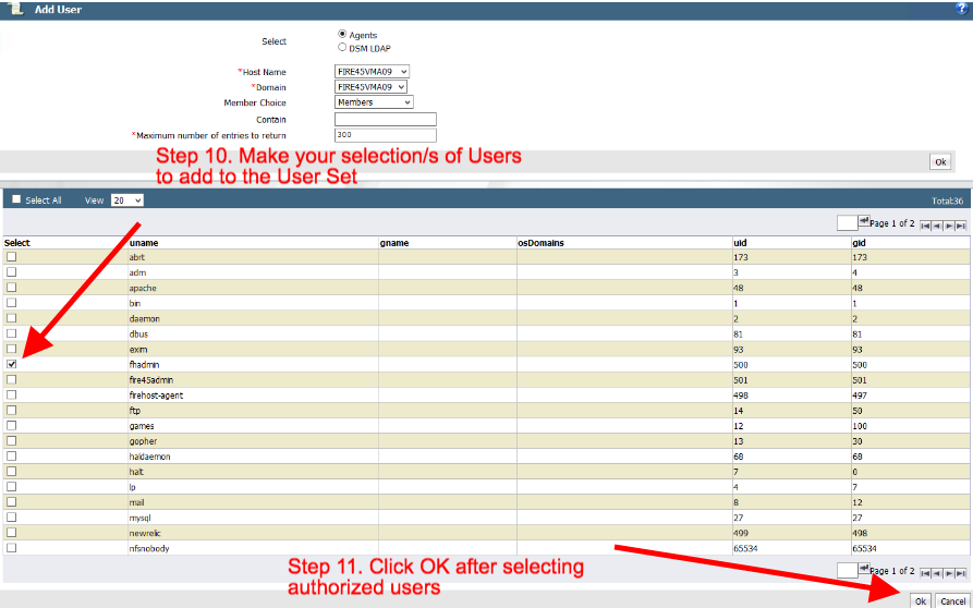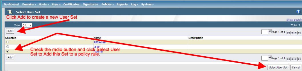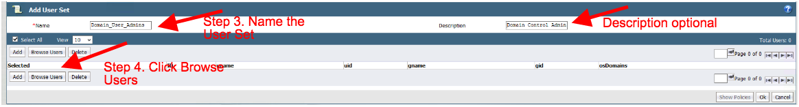(Optional) You can also modify an existing User Set. To modify, mark the button that corresponds to the desired User Set, click Select User Set, and then manually type the user information or use the remote browse feature to populate a user list on a specified virtual machine.