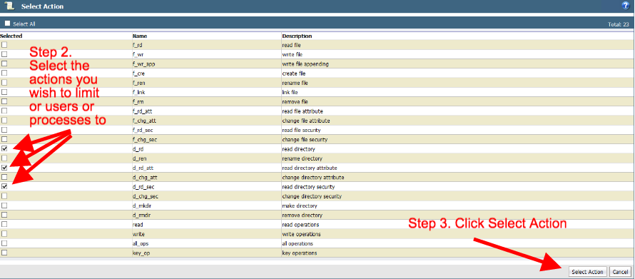 Action - Specifies the allowed file action, such as read, write, remove, rename, make directory, etc.