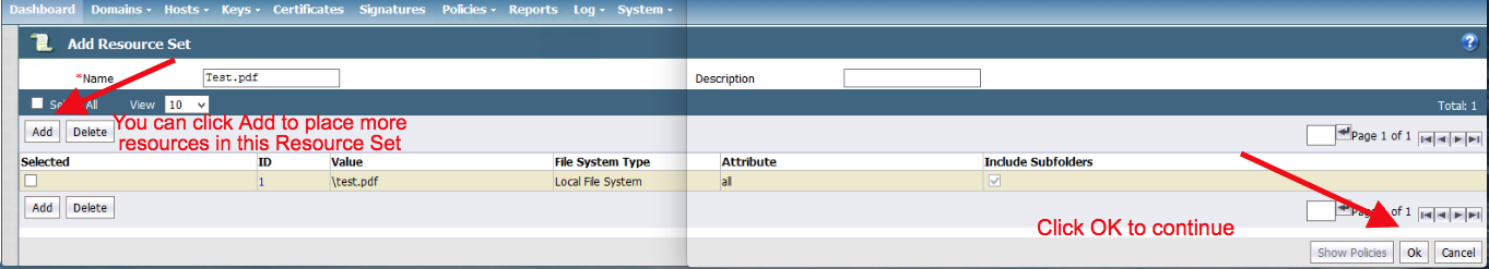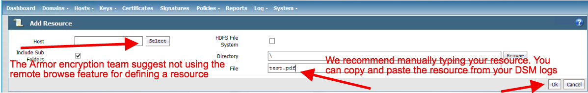 In the Add Resource screen, you can define a folder in the directory field, as well as individual files. When you specify a resource, the typed path must start where the GuardPoint ends. In the following example, the intended resource is test.pdf, located inside the C:\Data directory. Since the GuardPoint is C:\Data, you can manually type in your resource in the File field.