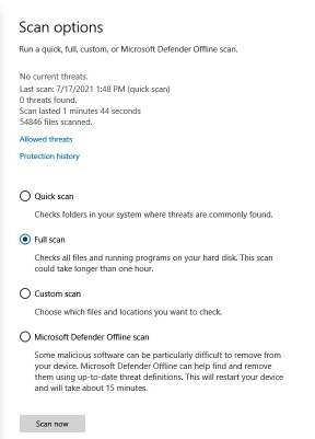 Select the “Scan options” text under the “Quick scan” button, as we would like to do a thorough scan of the system and click the “Scan now” button.