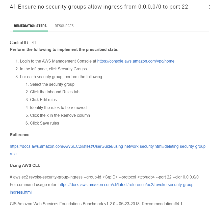 The Remediation link will open up additional tabs in a sidebar where you can get the remediation steps and resources for the control as shown below: