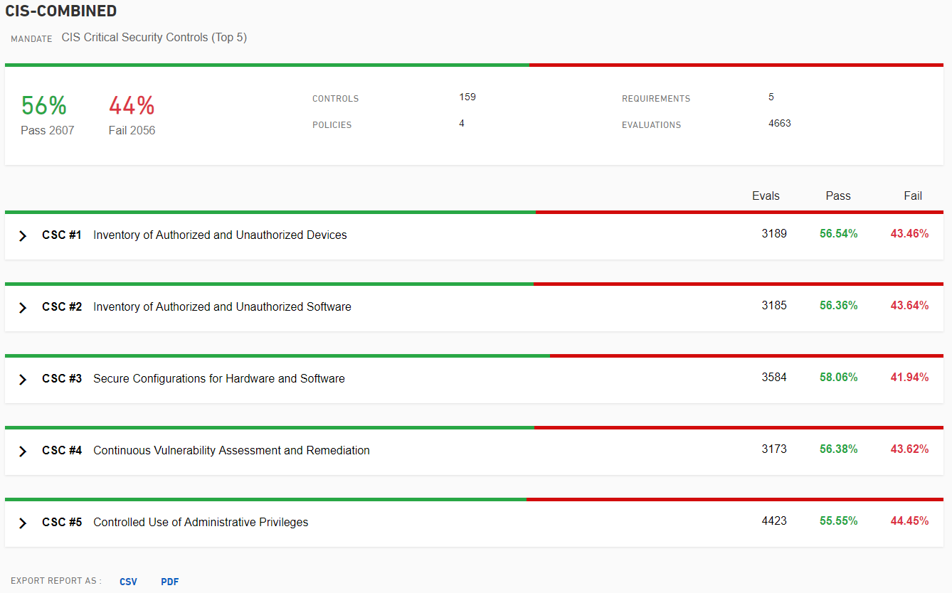 Reports in CSPM provide a pass/fail score percentage for a selected mandate against resources in a cloud environment. Mandates are made up of controls that your environment is evaluated against. The accumulation of these pass/fail metrics is delivered as the report.