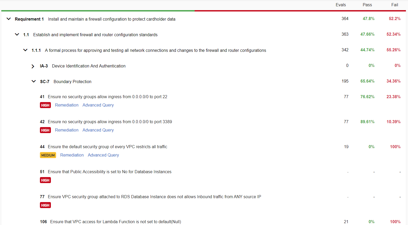At this level the control id is on the left and the pass rates for each individual control are on the right as well as how many resources were evaluated for that control. Under each control there are two links: Remediation and Advanced Query.