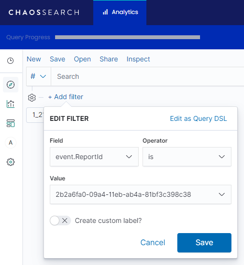 Then set the field to one of the helpful fields above, select the operator, put in the value and hit save. The data is now filtered on a specific reportId, Policy or other field selected.