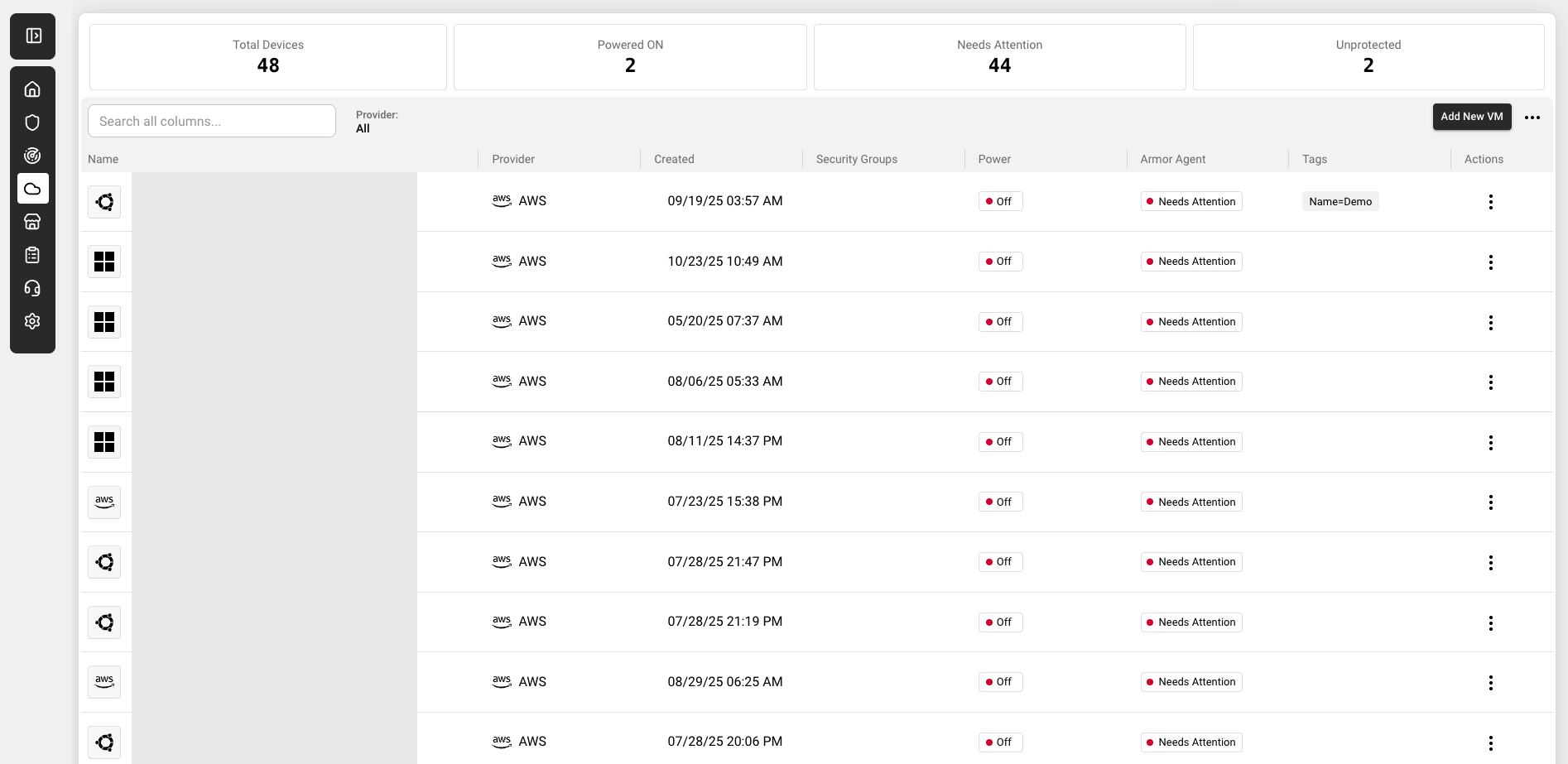 Note: If you are in the legacy Armor Management Portal (AMP), in the left-side navigation, click Infrastructure then click Virtual Machines.