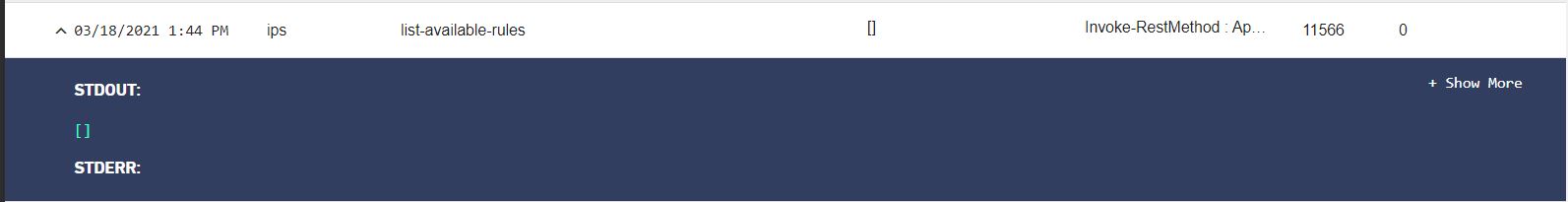 Clicking the Expand icon next to the Time Stamp of a result will display the output stream, which can be collapsed or expanded using the + Show More and - Show Less toggle on the far right of the stream window.