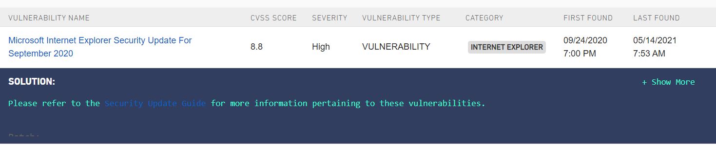 In some instances, a solution is provided below the vulnerability. For example, vulnerabilities from the Internet Explorer category will provide a link to Microsoft's Security Update Guide. Clicking the name of the vulnerability will take the user to the Vulnerability detail screen in AMP