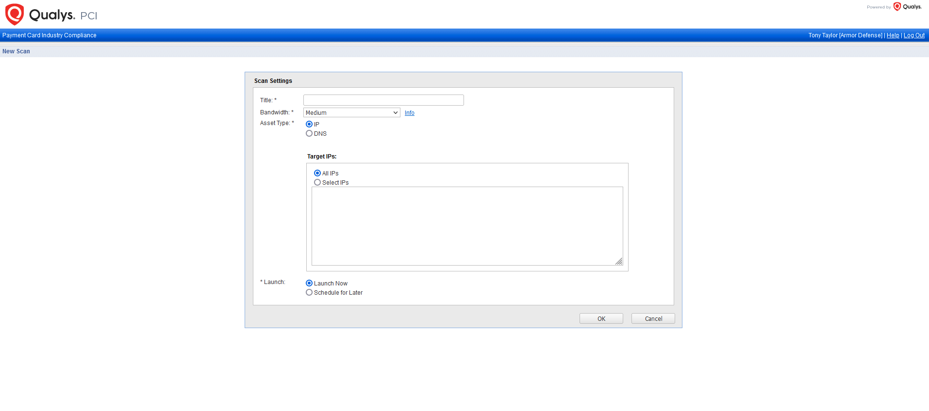 Upon configuration of your Qualys scanning services, Armor will create an initial Administrator account in the Qualys merchant portal for you to initialize your scanning.