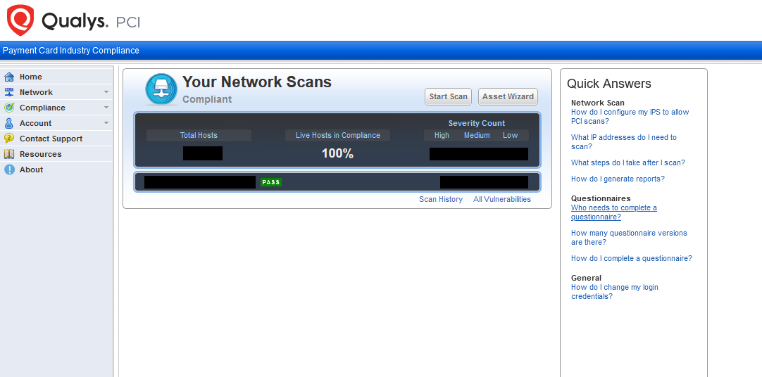 Regular scans are utilized within Qualys to track vulnerability count, False Positive submission and remediation efforts. Scans will have a compliance status of PASS or FAIL, indicating if vulnerability are still detected that would fail the PCI Report attestation.